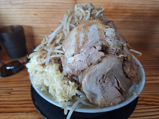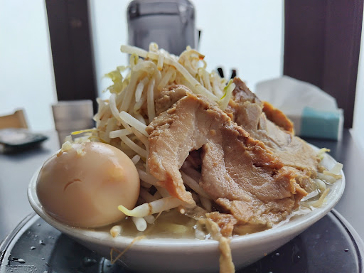 Read moreR6.10 極太麺(しょうゆ) 特盛(500g 180円) チャーシュー1枚×2(200円×2) 麺カタメ 野菜 普通 ニンニク マシマシ アブラ 大盛 (カラメ は 卓上カネシ) 11時25分 中待ち3人 外待ち2人 計5人に接続 食券先買 旨 待客から アドバイス あり 11時45分 店長案内で カウンター着席 テーブル席多く 同時案内他客4人は テーブル 暫時 食券回収 味聞かれ デフォ(のはず)しょうゆ オーダー バリカタできぬが カタメOK 同時に コール要求 ヤサイ マシできぬ 普通か少なめ 普通で店内写真以上の盛由 ニンニク マシマシ可 アブラ マシマシでなく大盛由 ワンオペだが 手際よく調理 こまめに手洗い カタメ 同時案内他客より 2分程早く 麺あげ 11時55分 着丼ビジュアル よき 標高高く ぶた9号目まで覆い 麓に厚いニンニク地層 頂上のタレ染むアブラ溶岩の如し 荒々しく美しい ヤサイ 茹で加減 絶妙 少し掘れば 麺 ツルツル形良い若干縮れた極太 少し黄色く卵麺か 丁度 芯に火のとおったカタメ バリカタでないが よき歯応え 小麦臭ない非オーション 甘く上品な麺 めっちゃあり だが 二郎でない ぶた 厚くないが ホロホロ崩れ めちゃうま 関内二郎 豚山 より うまいかも って何枚貼付いてんの 元々2枚 追加2枚 計4枚 とちゃう 重なってる 8枚まで確認 崩れて分からんなる スープ 微乳化 液脂層厚く 豚ダシ効く 最初 薄味 下のカネシ混ざり しっかり醤油 よき 二郎と...