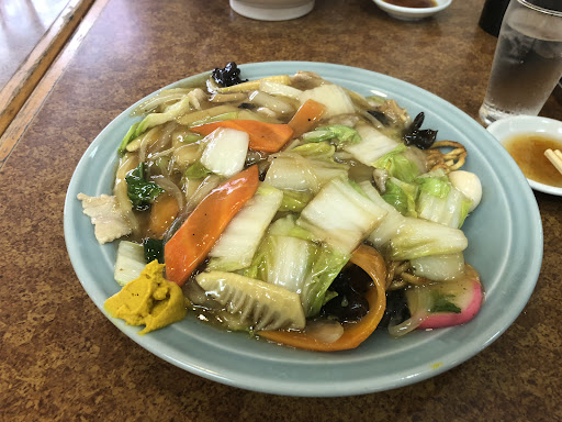 五目あんかけ焼きそば大好きです。 所々パリパリの麺がイイ感じ。これもすごいサイズです。スープ付き。