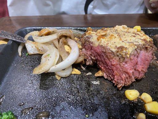 Read more土曜日ディナータイム。店内混雑。この店舗は初めてでしたが、数年ぶりにパートナーと行きました。 ヒレステーキ250gをミディアムで注文、配膳まで20分強、まぁ混雑してたから仕方ない。 到着した肉がまぁぬるい、肉の上で溶けるべきバターが溶けない。玉ねぎに火が通る気配もない。鉄板が手で触り続けられる程加熱されてない。 再加熱をお願いしましたが、やはり鉄板はぬるい。バターも追加してないのに再度新しいものが丁寧にトッピングされて提供されてきた。もはや言うまでもなく溶けない。店員は再加熱の希望程度にしか受けとらえなかったようで、私の苦情気味な要求の真意が伝わらなかった。…とても残念です。 パートナーは食べる気も失せてしまい、楽しみたかったディナーの時間が台無しでした。 写真のまま残して会計し、店員と後から呼び出した店長に苦情を言い帰宅しました。 2人で¥8160-…もうステーキを食べたい時の選択肢に御社が入ることは決してありま...