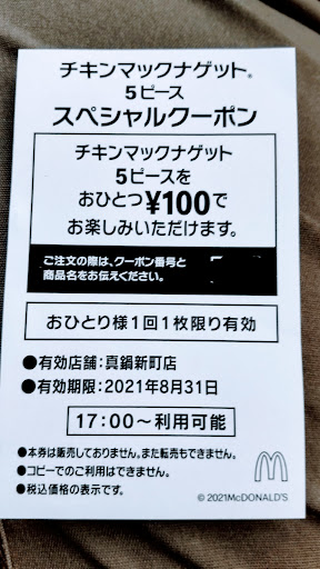 以前にもらった当店限定の割り引き券(マックナゲット)を使う為に立ち寄りました。ドライブスルーにてクーポン番号を伝えましたが画面にはハンバーガーの表示だったらしいです。会計時に男性店員さんに割り引き券を渡した時にハンバーガーではなくナゲットに修正してくれました。注文時に私がよく画面を見ていなかった原因もあります。因みに注文担当は女性の店員さん。どちらかの店員さんが気がつけば間違いもフォロー出来ますよね。...