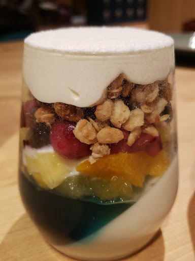 ◎ナナイロパフェ ゼリーにたくさんのカットフルーツと生クリームで構成されたパフェ 彩り豊かでテンション上がります(*≧ω≦) 写真を撮ってたら嫁が『一番上にパラパラしたのが乗ってないよ~』 オネーサンに確認したら作る人が忘れてた模様でカットされたフランボワーズが散りばめられて再登場 生クリームゎ甘さ控え目でとてもキメが細かい 中間層ゎシリアルとフルーツ フルーツゎクランベリー/ストロベリー/ブルーベリー/フランボワーズ/オレンジ/パインがゴロゴロ フルーツゎほぼ冷凍品なのでシャリシャリ クランベリーの酸味やパイン等の甘味が楽しめます