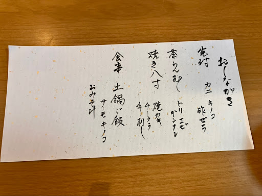 Read moreしもたや風の隠れ家的な落ち着ける店。 少人数での会食に最適、 予約制の会席料理 店の主人は京都吉兆での修行との事で、味付けは美味しく、盛り付けは綺麗。 無口で無愛想な主人も一興か⁉️ 旬の材料を用いて材料の味を出すのに、京風の出汁の旨さは吉兆仕込みか⁉️優しい味付けになっていた。 今回はシャブ鍋コースであったが、出汁を使った“しゃぶしゃぶ”はそのままでも旨味を感じた...