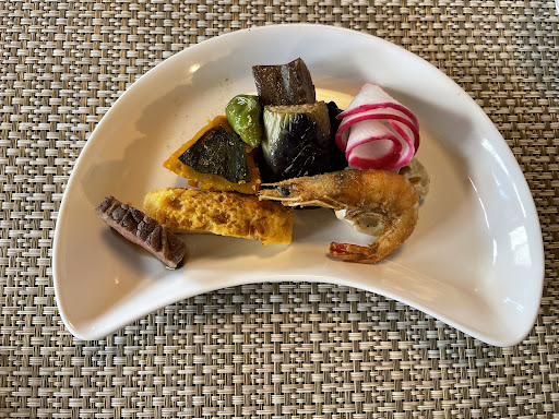 まず入店してから席につき、早々前菜が運ばれてきましたが最初から最後までなんの料理か全くわからず終わってしまいました。 お料理のメニュー表やドリンクメニューもありません。 コース料理の食事にはよく行くのですが、どこのお店に行ってもなんの料理か必ず説明が入ります。 忙しいからなのか、そう言ったスタイルなのかわかりません。 それと料理で気になった事があります。 カルパッチョを追加で頼んでいて、食材一つ一つはとっても良いものを使用されているようですがフルーツがとっても多くてお魚を食べているという感覚がわかりませんでした。 また、ご飯の粒同士がくっついていて部分的に柔らかかったり固かったりとあまり頂けませんでした。 その他の料理については全体的に味もよく見た目も綺麗で量も適量、満足です。