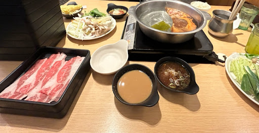 Read moreRead more味はよくある食べ放題のしゃぶしゃぶ店 日曜の夜初めて訪問しました。 忙しかったのか野菜の数種類やご飯は空っぽ。ドリンクバーの緑茶(ただの水が出てきました)やピッチャー?のウーロン茶は空っぽ。カフェオレ用の牛乳は空っぽ。とにかく食べ放題、飲み放題が出来るお店なのに補充の管理が全く出来てなかったです。 客に言われてやっと補充するって感じでした。 案内された席がドリンクバーの真横の席だったので、人がわさわさされて落ち着いて食べられなかった。が、逆に色々気づいてしまいました(笑) ワッフルを小学生の男の子が1人で焼いてましたが、トッピングのソースのフタを下に落としてて、そのまま拾ってフタしていたのが物凄く気になってしまいました(_