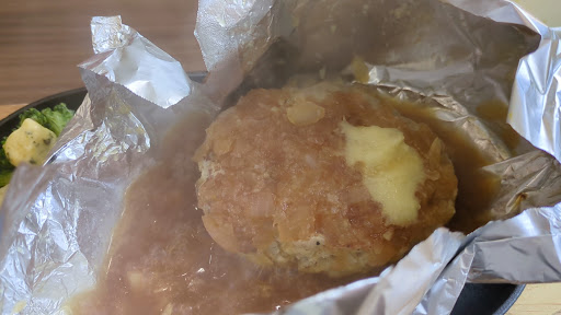 Read more日曜日のお昼に伺いました。4人がけのテーブル席が3つと、2人がけの小さなテーブル席が1つとカウンター席。最初に食券を買って席で待ちます。私は包焼きハンバーグを、連れは生姜焼きを注文。セットのサラダがまず運ばれてきました。生姜焼きは、ご飯が進む味でした。包焼きハンバーグは、熱々の状態で運ばれてきて、テンション爆上がり!包みを開けてみると、玉手箱かと思うほどの湯気が。にんにくが上に乗っていて、甘辛な味の豚肉のハンバーグでした。ご飯がおかわり自由!それも、ガーリックライスと白米から選べます。ガーリックライスをいただきました!包みの中のソースをすくうスプーンがあると、ご飯もう1杯いけた!という位ソースが美味しかったです。 席が2人がけで、外から丸見えなのが恥ずかしかったです。2人で2...