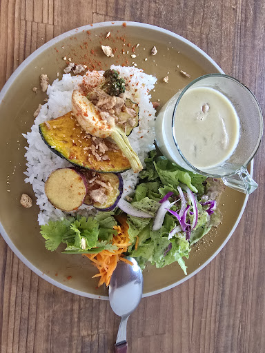 Read moreランチに訪問。11時15分ごろかな?席は空いてるけどお料理運ばれるまでにお時間かかりますけど良いですか?と女性のスタッフさんから丁寧なアナウンスあり。予定無いのでのんびり待たせてもらいました。待っている間もその女性スタッフさんはテキパキお客様対応し、声掛け、挨拶、聞いていて素晴らしかったです。調理場の男性の声も挨拶や対応中の話し方からして人柄が伺えました。極めつけは食べ物!!昨今ドリンク別の2千円超えのランチが蔓延る中、確か1300円位(チキンのグリーンカレー)!ドリンク別だろ?と思ったら込みですって!しかも量もたっぷり入って来たー!!!デザートもアボカドと赤いグレープフルーツのチーズケーキを頂きました。これは美味いです。タルト生地みたいなところの層も職人技の厚みでまじまじと見ちゃいました。味ももちろん、スタッフさんが素晴らしかった。また待ってもいいのでお邪魔させて...