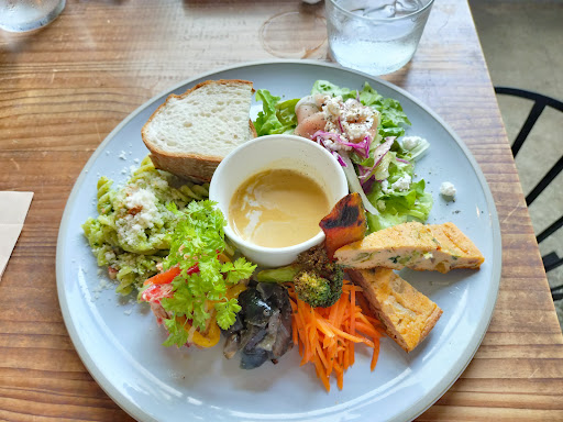 お店に入店したとたん店員さんに乗り合わせで無いと車の移動をお願いするかもしれないと注意喚起され、初めてで知らなかったため申し訳ない気持ちになった、、 予約はしていなかったがオープンして間もなかったからかすぐに席に案内していただけた。ランチで日替わりサラダセット(¥1200)を注文。ドリンクもついてくるのが嬉しい。 サラダセットは本当に野菜がたっぷりで彩りも非常に綺麗で盛り付けも美しく、目でも楽しめる。サラダだから少なめかな?と思ったが食べてみるとかなりボリュームがあってヘルシーでお腹いっぱいになれることにびっくり!ジェノベーゼのペンネとさつまいもとビーツのポタージュが特に美味しくて感動。一つ一つ丁寧に作られているんだろうな〜と感じた。