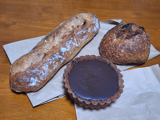 Read moreR6.11 うまいバゲット 探してネサフ 見つからん 取り敢えず ハード系の人気店 土曜11時 細い道入った 住宅街 え パン屋あんの て あった 店前と道挟み 駐車場 空 人気ない 入口 低いウッドデッキ階段の上 ドアノブ なぜか上に捻る なんなん が ドア開けた瞬間 声出た 色濃い ハード系 揃えてる 惣菜パンとか色違い置いてなくて ショーケース すっきり落ち着いてる パン·ドゥ·ミ カンパーニュ系 ブール系 なんか混ぜたのん色々 ハードとちゃうクロワッサン タルト·オ·ショコラもある けど バゲット籠 ない あー ショーケース中 バゲットて表示ある 短うて太いパン ある バゲちゃうし しょーない けど うまそうやから バゲットなるパン 好きな無花果パン チョコ欲しいてタルト·オ·ショコラ 買う ショーケース向こう店員 よー見たら 日本人ちゃう 尋ねたら フランス人やて ほんでか 店の雰囲気 ドアノブ パン見た目 日本的やないの フランス人と話す ムッシュやっぱブーランジェ コルシカ出身 18年前 来日 奥さん日本人 仏語ペラペラ 子供さん トリリンガル 奥さん姓 有名小説の主人公と同じて 自慢みたい 来日前 1998年~2006年 パリ住んでた て 私住んでたんと同時期 ムッシュはモンマルトル 私は16区 パリ話題 弾む ちと縁あるリヨン近郊の三ツ星 ラムロワーズ 知ってるか訊いたら …知ってる… て 絶対知らんやろ 細く長いバゲ焼かんのか訊いたら うちのバゲは高級なこの形て ちゃうやろ 庶民のバゲ焼けよ バゲ何時に焼き上がるか訊いたら 9時頃て 遅いわ 朝食に間に合わん フランス人 やっぱ 楽しいわ バゲット カワ硬い これやね 小麦薫り濃いて おいしい けど太短い やっぱバゲちゃう バゲは 細くて長く なければ ならない 宇都宮のモーガン のバゲがエエな 神戸の山のパン 横浜のL'île des pains も良かった 無花果パン これエエわ フィグ·セッシュ たっぷり 甘く風味強 パン色濃い 硬い 芳醇 大好き タルト·オ·ショコラ タルトは お約束のパートゥ·シュクレ フィリングのガナッシュ ゆっくり口溶け 滑らかなコク 柔らかな苦味と甘さ上品 下に 濃いメープルシロップ 薫りよき 楽しいし パンうまいから また来よ ただ...