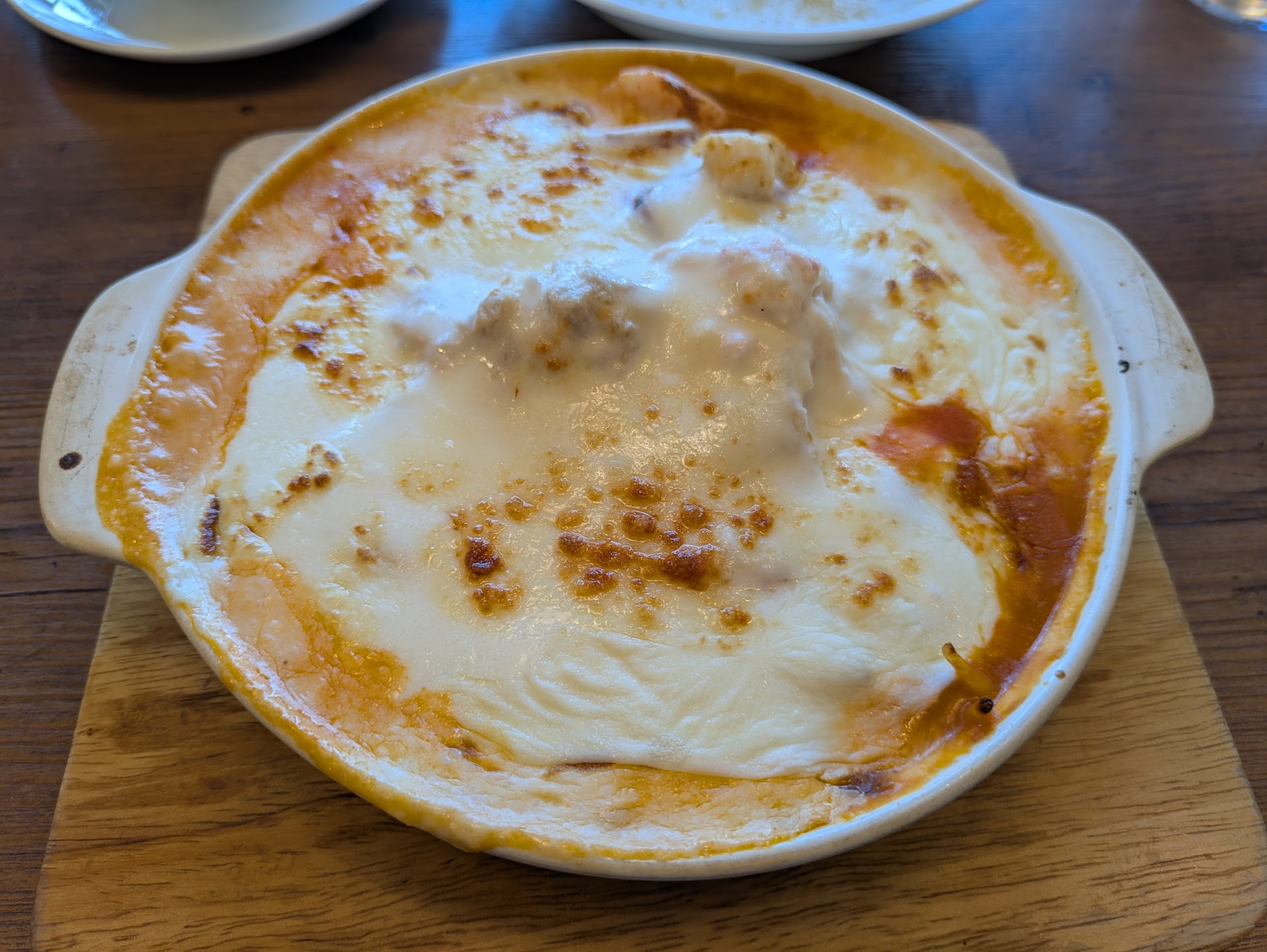 メインの海賊パスタは大きなグラタン皿にミートソースパスタ、ホワイトソース、チーズの順に重なったボリュームのあるひと皿です。 イメージとしてはラザニアでしょうか。 エビやイカ、カニなどの海鮮も結構ゴロゴロと入っていて量はとても多いです。 女性が食べるには量が多そうです。周りの女子会マダム達は普通のパスタを頼んでいる事が多かったのはこのせいでしょう。 味は美味しいですが、少し変化に欠けると思いました。提供まで時間がかかっていたのでサラダもスープも既に完食、パスタとお冷しかないので少し飽きる部分があるかもしれません。かなり重たいパスタでひと皿食べるのが辛い人も居るかもしれませんね。