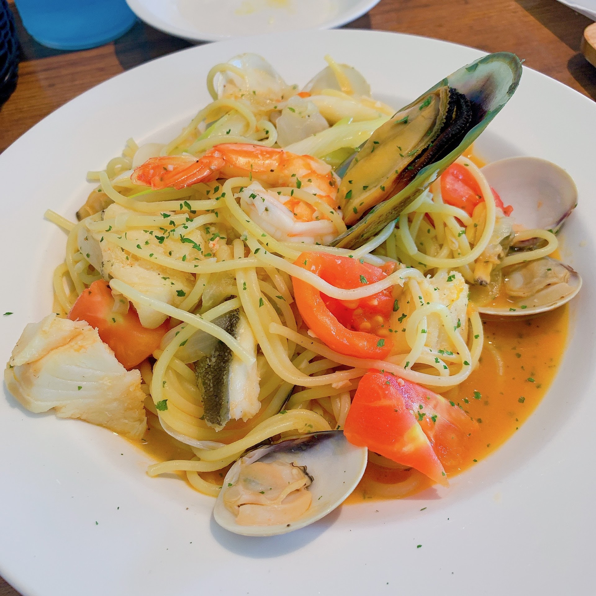 シーフードペペロンチーノ…唐辛子が効いていて辛うまでした。生パスタにしましたが美味しかった。オイル系を期待したのですが、生トマトの海鮮スープスパに近くて、ペペロンチーノとは違うイメージかもしれないです。