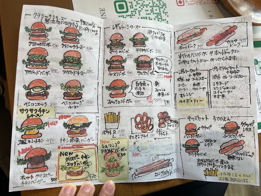 メニュー表に関しては、手書きで可愛らしいメニューではありますが…一旦、写真でみたいですね! 手書きではイメージに限界ありました メニュー看板を見ると、写真があるバーガーもあるので出来ないことも無いのであろうとは思いますので、手書きメニューも残しつつ1つくらいは全部写真のあっても良いのでは無いかと思いました。 あとは紙ナプキンがないんですね!! 店内に手洗い場があったのでよかったのですが、せめて...