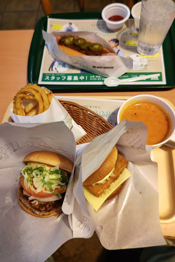 仕事の帰りに、通り道なので時々立ち寄る。時間帯のせいもあってか、大体いつも空いているので、一番奥のベンチシートで寛ぎながらハンバーガーを食べることが出来る。オーダーするのは大体いつも一緒。モス野菜バーガーにフィッシュバーガー、スパイシーチリドッグにフレンチフライかオニポテ、これにケチャップ少々、マヨネーズ少々をつけてもらってあとは氷入りの水を一杯。飲み物はこれと別に 夏であれば季節限定のシェイク、冬の寒い時季にはトマトチキンチャウダーなどの温かいスープ。 気のせいか野菜のヴォリュームやチリビーンズの具合が近隣の他店に較べ 良いような気がする。 個人の感想です、が。 夕方六、七時辺りの時間を過ごすのに...