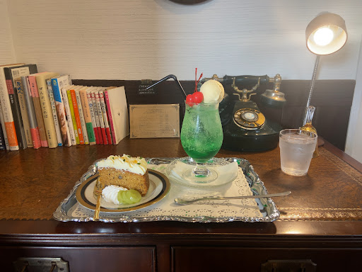 Read more趣味で描くイラストの参照にしたい思いで丸いシルエットのフロートグラスにメロンクリームソーダが入っている物を出されているお店を探していた折に入らせて頂いたのですが、その事しか頭に無かった私には場違いなくらいお洒落で素敵な喫茶店でした。 正午過ぎくらいに車で伺ったのですが、丁寧に店の駐車場の場所を教えていただいたり、注文の際に気をかけてくださったり、写真を撮らせていただくのも快く応じてくださって何から何まで優しくて有り難かったです。 写真の通りにここで食べて良いの?と思うくらい素敵な見た目と手触りの机で飲み物も食べ物も小物もとにかく美しくどこか郷愁を感じる中で、キャロットケーキとメロンシロップ(シロップが選べました)のクリームソーダとスパイスチャイを食しました。 全部美味しかったのですが特にキャロットケーキがとても美味しいです。ケーキ上部の濃厚な質量を感じるチーズクリームと胡桃かな?が入ったケーキ生地が、重すぎず軽すぎずそして甘すぎず体に優しい味でしたし、そこに添えられた生クリームと輪切りのシャインマスカットで甘味と微かな酸味を自分で調整できる事にお店の方の心尽くしを感じました。 店内の雰囲気は静謐で、読書を愉しみながらデザートを満喫する場所なのかと思います。 とても良かったで...