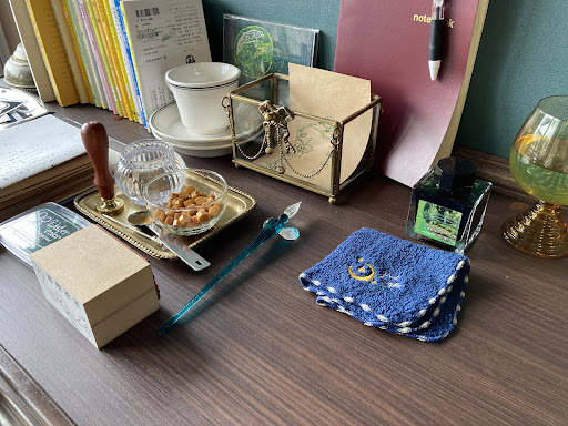 Read more畑の中にある、とても素敵な喫茶室。 店内の雰囲気は、クラッシック音楽が流れていて、落ち着いた雰囲気です。 お店の真ん中にあるテーブルにはテイクアウト可能なお菓子が置いてあります。 そして、カウンター席には小説、そしてガラスペン、ペン用インク、ゴブレット、便箋に封筒が揃っていて、なんと試し書きが可能です!ガラスペン、少し憧れます。 そんなペンで綺麗な文字で手紙を書けたら最高だなと思います。