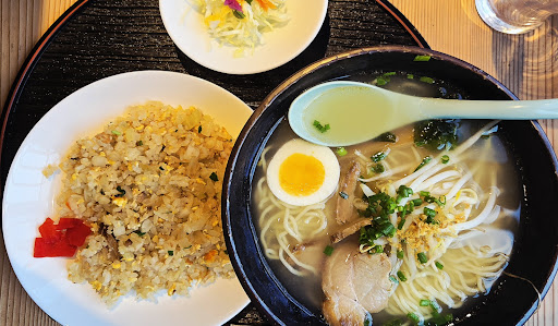 前々から気になっていましたが、タイミングが合わず初めてお邪魔させて頂きました。 店内オシャレです。 入って右にテーブル席と、左に掘りごたつの座敷、奥にもテーブル席がありました。 今回は奥の2人がけのテーブル席に座りました。 私は『しおもやしの辛トッピング➕Cセット』、相棒は『しおにんにく➕Cセット』を注文しました。 相棒のラーメンが運ばれて来た瞬間、ニンニクの香りがものすごい!1口スープを吸っただけで口の中がニンニク!ニンニク好きにはたまらないと思います。 しおもやしはもやしシャキシャキで、スープもちょい辛になっていて美味しかったです。 ただ... 麺が柔らかい。 Cセットの焼き飯の味が薄め。 おしぼりもティッシュもない。 です。 ボリュームはちょうど良かった...
