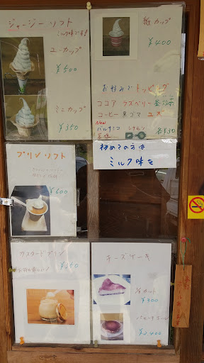 ソフトクリームやチーズケーキ、プリンなどを販売しているお店です。 ソフトクリーム(カップ)400円 ソフトクリーム(コーン)500円と値段は高め 味は普通でした。 チーズケーキ(8カット分の1)300円 ホールは2400円 プリンは350円 と、いろいろあります。 チーズケーキは正直オススメしません。 最初に若干のチーズの味がしたら、あとはやたらレモンの酸味 レモンケーキかな?ってレベルでした。 レモンケーキだとしてもオススメしません。 プリンは味は普通。手作りプリンって味 量が少ない。値段とあってないなって感じです