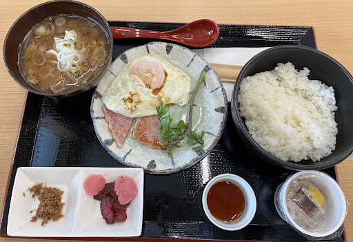 別日土曜、朝食時間9時くらい。 店前の駐車場は数台分空いてるくらいで駐車台数は多めだが売店やレストランはそんなに人は入ってなかった。 事前にネットでメニュー見て決めてたけど、レストラン入り口のメニュー表でネットに載ってなかった目玉焼き定食を発見。レジ横には数量限定だし茶漬けのメニューもあったけど朝も注文できたのか確認しなかった。限定や最新メニューはサイト更新追いついてない事もあるので現地でのメニューチェックはした方がいい。 カウンターで注文して精算して着席、レシートに書かれた番号呼ばれたら取りに行く。支払いは現金以外にクレジットや一部QRコードも対応。 セットと別注文のサラダ鮮度良し。ドレッシングはレジ横のをセルフで。 豚丼は汁だくでご飯にしみしみ。あぶらベタベタでもないし、とがってないあまじょっぱさで食べやすい。量は家庭...