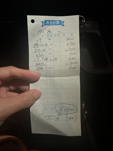Each dish was carefully made and all equally delicious. Our total at the end was about 8/9000 yen for 2 people, we weren't given a receipt so we had no idea how much each dish was. They take card as payment, so that...