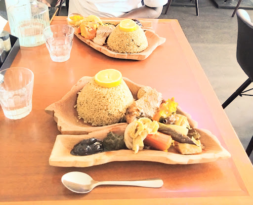 Read moreユネスコ無形文化遺産のセネガル国民食チェブジェンは日曜日限定です。セネガル国土ライオン横顔の形のお皿でいただきます☆タマリンドのペースト(ダッカール)、薬味やスパイスをすり潰したペースト(ノコス)、ハバネロソース(ピューマ)が添えらています。人参(キャロ)、大根(ナベ)、カボチャ(ナジョ)、キャベツ(シュパメ)、ナス(バタンセ)、白身魚(ジェン)、炊き込みご飯(チェブ)あたりは日本人に馴染みやすいかもしれません。色がなくなってヘロヘロにやわらかい小さなカボチャみたいな野菜はニガウリ(ジャガド)、甘みと色のないサツマイモみたいな芋はキャッサバ(ニャンビ)。 狭山ヶ丘駅近くのワールドフードレストランセネガル料理店の2号店として2月に開店。隣はアフリブティック、坂戸駅近くで長年愛されてきた店舗から4月に移転。セネガル料理食材、雑貨、日用品が購入できます。レストランはケバブメニューとセネガル料理を気軽に楽しめます。日本語、英語が通じなくても、他のセネガル人客が、フランス語とウォロフ語を通して通訳してくれます☺️...