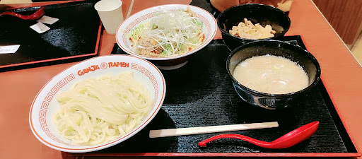 注文は自販機のチケット制 支払いは現金のみ 私は「つけガンジャ」相方は「冷やし汁なし坦々麺」をチョイス チケットを渡すと呼び出しブザーみたいなの渡されて席で待ち〜 ピーピー鳴ったら出来上がり お店に取りに行って ではいただきます(^^)