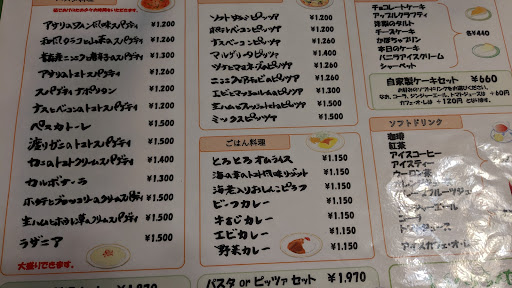 ・お昼の部のメニュー構成は以下でした。 □□□メニュー概要□□□(25年01月時点) ■お得なランチセット □ *日替わりランチ(黒板記載) (1,000円)※パンorライス付 □ *本日のおすすめ料理(黒板記載) □ *ロールキャベツ (1,100円)※パンorライス付 □ *カニクリームコロッケ (1,100円)※パンorライス付 □ *ビーフカレー (1,200円) □ *地鶏のミラノ風ジャンボカツレツ(1,350円)※パンorライス付 □ *サーロインステーキのグリル・黒コショウソース(2,000円)※パンorライス付 □ *ビーフシチュー (1,700円)※パンorライス付 □ *ミネストローネ (700円) □ ※上記のメニューに+200円でサラダ付き ■お昼のパスタ □ *アサリのワイン風味スパゲティ(ボンゴレビアンコ)(1,300円) □ *アサリのトマト風味スパゲティ(ボンゴレロッソ) (1,300円) □ *和風タラコと山菜のスパゲティ (1,360円) □ *カルボナーラスパゲティ (1,400円) □ *海の幸のトマト風味スパゲティ(ペスカトーレ) (1,600円) □ *カニのトマトクリームスパゲティ (1,500円) ■お昼のピッツァ □ *マルガリータピッツァ (1,400円) □ *生ハムとフレッシュトマトのピッツァ(1,600円) ■お昼のセットサービス □ *ドリンクセット (+250円) □ *ドリンク+自家製ケーキセット(+650円) □□□□□□□□□□□□ ・上記に加えて、自家製ケーキとソフトドリンク、ビールとグラスワインの構成。 ・結構なバラエティに富み、どれも美味しそうな響きのメニューなので、チョイスにかなり悩みました💦