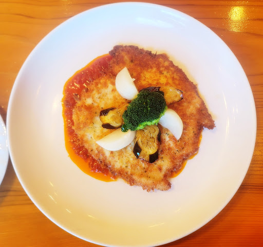 * 地鶏のミラノ風ジャンボカツレツ(1,350円) でかーーーーっ!なジャンボカツレツ。 ソースの上にジャンボカツレツがでーんとのっかっており、その上には、素焼きな茄子とカブとブロッコリーが。 お肉はナイフですっと切れる柔らかさ。パリッと食感×ジューシー食感×ソースと良く絡んで美味。 味も見た目も素敵なジャンボカツレツでした。カツレツが大満足過ぎる量なので、逆にライスがもっと食べたくなりました笑