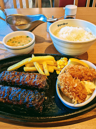 Read moreブロンコビリー 鶴ヶ島インター店へ行ってみました。 駐車場は車46台収容可能で、そのうち 軽自動車専用が 5台分、車椅子利用者等専用駐車スペースが入口の近くに1台分確保されています。入口 への段差はありません。 駐輪場は入口の近くにあります。 入口 入ってすぐの所に置かれている消毒液を使って手指消毒してから入店します。感染症予防対策として、店内ではマスクの着用が求められています。サラダバーや ドリンクバーを利用する際はマスクを着用し、ナイフやフォークと一緒に運ばれてくる 「薄いビニール製の手袋」を利き手にはめてトング やジュースのピッチャー 等をつかむことが求められています。 店側としても 店員さんのマスク着用はもちろん、食器等を下げる時にアルコール消毒液を十分に含ませた台ふきんでテーブル 周りをしっかり拭き上げていました。 今回は、290 g粗挽きハンバーグ& 牡蠣フライ ランチ(ライス・ スープ・ サラダバー付)にセットドリンクバーを付けて美味しく頂きました。 ★STEAK HOUSE★BRONCO BILLYは1978年 創業ですが、 この 鶴ヶ島インター店の施設・設備は新しく綺麗です。背の高い 赤い ベンチシートに囲まれた四人掛けの席がたくさんあり 、テーブルや天井は 木目調、内装や BGMは古き良きアメリカをイメージしたものです。 トイレは、男女別トイレに加え、 車椅子利用者の方も使いやすい、スペースにゆとりを持たせた多目的トイレ(おむつ交換台付き)も備えています。 このお店は 、ステーキや ハンバーグを中心に 、サラダバーも充実しています。ドリンクバーについては、定番のコーヒーや炭酸飲料に加え 、フルーツミックス・りんご・ オレンジ・ ぶどう等、果汁100%ジュースの種類が多いという印象です。肉も野菜もジュースも、ちょっと贅沢にしっかり摂取したい時に向いているお店です。 このお店は、お持ち帰りメニュー もあり、電話予約にも対応しています。 支払いは 、各種 Pay や...