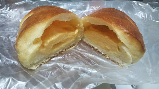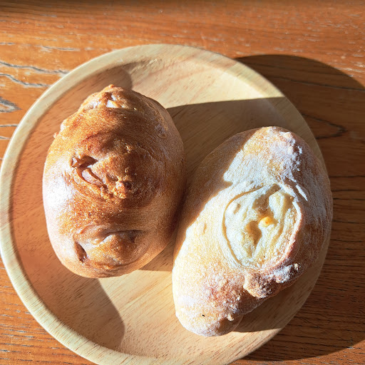 Read moreリハビリ散歩中で、開店頃見計らって歩いてきました。店員さんは女性の方2人で仲良さそうな和やかな雰囲気でアットホーム感を感じました。また、近所の方や常連さんとも気さくに話しをされていました。これぞ街のパン屋だなと。因みに手提げ袋は3円でした。(必要な場合) パンはハード系のパンでチーズバーグパンと塩パン、ベーコンオリーブパンを買いました。ベーコンオリーブは写真録り忘れました。チーズバーグパンはこの固さと全粒粉なのかな?の味があるので、ハンバーグとチーズはともにそんなに味をつけていないのですが、それが、パンの塩味とあわさって大変美味しかったです。また、塩パンはこのハードの固さと塩味があわさって美味しかった。オリーブとベーコンはちょっとオリーブがくどかったかなとは少し残念に思いました。 駐車場はたぶん幹線道路側一台と側道側1台と道路向かい側のパンと書いてあるオレンジの...