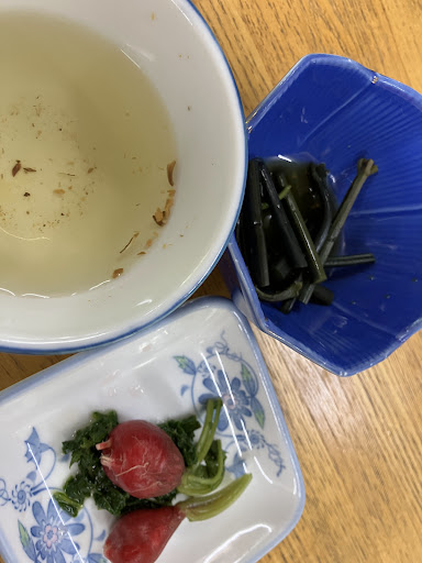 季節限定、 月山竹の天ぷら看板が目に入り思わず注文。 お母さんから出された湯呑みに、何か浮いていたので思わず.これ.何茶ですか と聞く。 きのこ茶ですよ と。 ?なんだきのこ茶って。 飲むと、塩気が強いが、なるほどきのこ風味。隣接している売店で、まんまと購入。 粉末を料理にも利用できるらしい。
