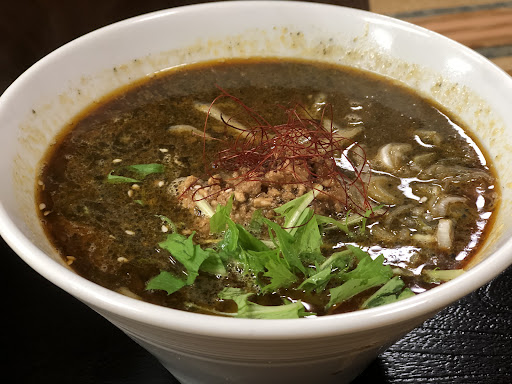 黒胡麻醤油坦々麺:胡麻の風味と山椒がかなり効いており、醤油感はあまりないですが好きな人にはささる味。麺はかなり細麺で、透き通ってるくらいな感じでした。