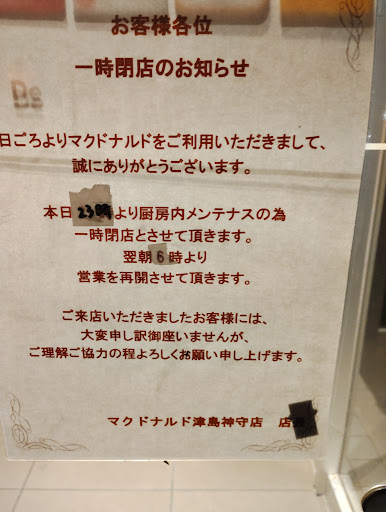 このマクドナルド津島神守店は よくメンテナンス作業を理由に 臨時休業しますが発表する時間が 明らかにおかしいです。 普通ならば急にメンテナンス作業の予定が入る事は考えられず… 当日の閉店1時間前に来いですね? 告知するのは 止めて下さい! 他の飲食店ならば3日前位に告知して います。 公式HPにも記載情報は無く… 知らずに来店するお客の時間と労力の無駄を少しは考えて改善して下さい。 前回の口コミにも他の方も24時間営業の意味が無いと投稿してますが 全く改善が見られないので… もしかしたらメンテナンス作業という名の人件費削減が理由ですか? その証拠に業者らしい車や店内の様子からも作業してるとは思えないです。 近年稀にみる酷い店です。 今後も同じ事が繰り返されて改善の見込みが無いならばマクドナルド本社のお客...