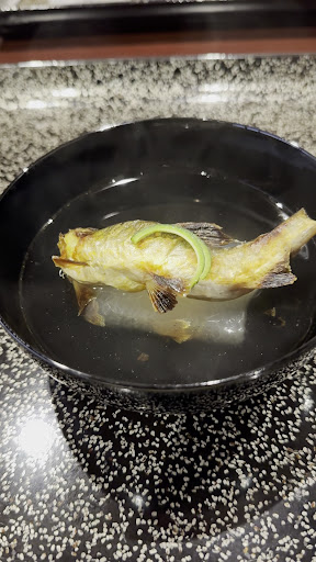 ■冬瓜と鮎のお椀 冬瓜を食べ切ると中から金のウサギが出てきてお月見出来る。優しい出汁に入る冬瓜と鮎をシンプルに楽しむ。