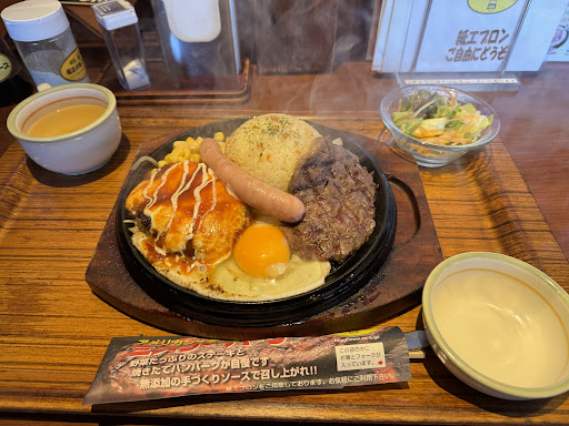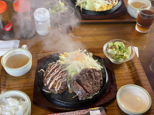 Great meals, great atmosphere, awesome staff, and good costs,! Definitely a ⭐⭐⭐⭐⭐from me. The menu is mostly based on steaks or hamburg steaks,. Or both. The costs are from 500¥($5) to 2000¥($20). mostly set meals, and you can adjust the sizes of what you want to eat. One amazing thing of this restaurant is the meals come out super hot 🔥. So you can also adjust the wellness on your meat, which is awesome. I recommend taking of your clean Jacket or white shirt, because hot steaks mean juicy sauce sizzling everywhere!! There are free paper aprons to use, so go ahead. One more thing, the sets come with " all you can eat" rice, soup, and drinks, ( several types of cold tea, and coffee, and some fruit juice) which will fill your tummy...