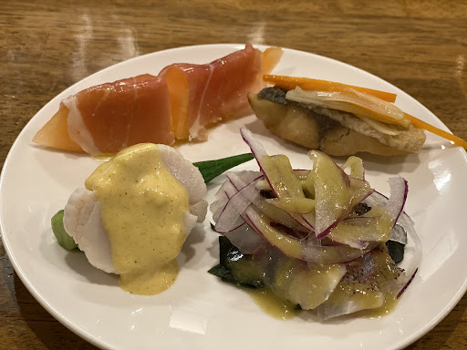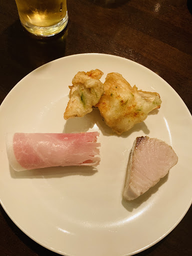 [お通し] 生ハムメロン、鯵のエスカベッシュ 仙崎産イサキのカルパッチョ ホタテのカレーソース