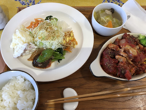 サラダのボリュームがすごいです。たくさん野菜が盛られ、味もそれぞれなので食べ応えがあります。味が薄いという方もいらっしゃるみたいですが、私はしっかりしてると感じましたし、子どももモリモリ食べられるほど食べやすく工夫されていました。日頃の夕飯にもこれだけ野菜が取れればいいだろうなぁと思いました。 スープにもきのこと野菜がたくさん入っています。 季節によってサラダやスープの野菜も変わるみたいです。 ごはんとスープがおかわりできますが、ボリュームがあるのでおかわりできませんでした。 ミニデザート(ゼリーやプリンなど数種類から1つ選べます)と飲み物(コーヒーや紅茶、オレンジジュースなどから1つ選べます)が食後につきます。 2人席が8つ、4人席が3つ 早い時間はおひとり様が多かったです。 12時半ぐらいは家族連れで1番混雑していました。