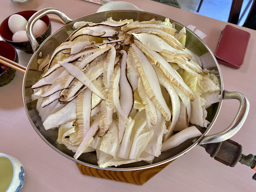 松茸山"美し園"さんが今年(2022年)の営業を開始したとのことで、早速行ってきました。 実は去年伺って美味しかったので今年も… 去年は車だったので酒が飲めませんでしたが今年は送迎車を利用したので酒ありです。どうせ飲むなら松茸酒(時価)!と言う思いでチャレンジしました。 では、そのへんの話をちょっと。 まず料金の話ですが、熱燗は一合700円、そこに刻み生松茸(時価 この日は10g1,000円)を投入するスタイルです。今回はメンバー合計3人だったので2合の熱燗に松茸10g投入した次第です。(量は写真を参照してください。)合計2,400円ですね。 熱燗に刻み松茸を投入すると次第に色が変わって松茸のエキスが染み出していることが分かります。肝心の味・風味ですが酒が熱いうちは酒のアルコールばかりが感じられて松茸の風味は全然分かりません。しかし、ぬる燗くらいになると風味が感じられる様になります。予算に余裕がある方は試してみるのもいいでしょう。余裕のない人は焼きた松茸と一緒に熱燗を楽しむ手があります。それでいいかもしれません。