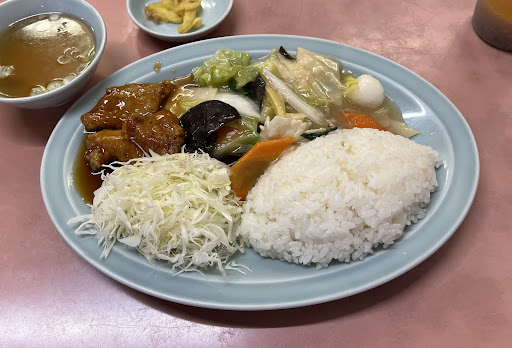 店内は、平成年間の街中華然とし、清潔感のある落ち着いた雰囲気でした。 正午過ぎでこれからが混雑本番、のタイミングで、単身喫食であってもテーブル席に通して頂けました。 単品アラカルト料理から、ご飯(丼)もの・惣菜もの・麺ものなど、メニューは多数あります。 その中でメニュー冒頭にあった「中華ライス(¥850)」を注文。たっぷりの温かい御飯に、黒酢酢豚・八宝菜・キャベツ千切りがワンプレートに寄せてある、コスパ・栄養バランスよく楽しめる一品です。 15分程度の待ち時間で、ボリューム感満載のライスが提供されました。酢豚は揚げ立てで黒酢がたっぷり、八宝菜は惜しげ無く大量に投下された新鮮なお野菜に、イカまで入った本格派です。 添えられた「たっぷり千切りキャベツ」も、新鮮さが中華惣菜二品の箸休めに良く合いました。 店内では他にも、ワンタンと各種惣菜をアラカルトで注文して、ボリューム中華コースを楽しむ強者老夫婦もいらしたりして、アットホームな雰囲気の中、和やかに久しぶりの中華ランチを楽しめました。 決済はまだ現金のみでしたが、女将さんに「大変に美味しく元気が出ました、ありがとうございました」と告げると、「お待たせいたしまして、またどうぞ」と気持ちよくお店を後にして、上田城址への千本桜祭りへ...