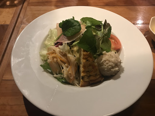 また、コンポートがはじめに出て来て、予期してなかったので好印象でした。 そして、サラダにも手を抜いてなく、ドレッシングがとても自分好みの味で、野菜もただレタスではなく数種類、生ハムやマリネされたしめじなどが入っていて、久しぶりにサラダが美味しいなと思いました。