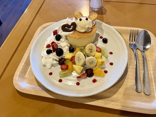 これが5回目の訪問。 メニューに「クリスマスとろとろパンケーキ」とあったので、50円高いクリスマスバージョン注文。 どこがクリスマスかと言うと、パンケーキの上に小さいパンケーキが1枚追加されていて、その上にサンタクロース。 ホイップクリームに銀玉とトナカイ。 でクリスマスかなぁ?? サンタとトナカイはプラスチックで食べられません。 まあ、通常版1000円で、クリスマス版1050円なので、こんな感じかな。