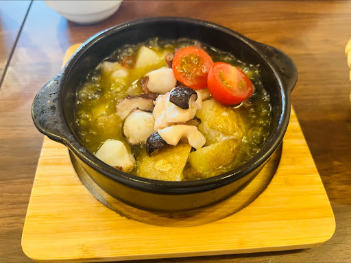 Read moreGW明け平日午後1:30満席でした オープンしたばかりだからね 大人気 前日からネット見て タコの入ったパスタと牡蠣のアヒージョを単品で注文 フリードリンク付きです お水もドリンクもセルフです ポットに入った冷たいドリンクと ホットはエスプレッソと紅茶のパックがいくつかありました セルフです アヒージョからきました パンはおかわり自由だそうで 牡蠣が7個 プリプリで美味しかったです タコぺぺというパスタは 石鍋でくるのでグツグツ熱々でタコも柔らかいし紫蘇がたっぷりで さっぱりと美味しかったです さっぱりとです これが石鍋なので煮詰まって 味が濃くなってきます でもタコぺぺはさっぱりです それにアヒージョのパン浸しても美味 きっとパスタだけだったら足りなかったなあ パスタはお上品サイズ スープサラダ付きのセットとか パスタとアヒージョのセットにパン2人分とか 色んなセットあるみたい おひとり様で行く分にはいらないけど 店内はお2人様用の席7割 4人で座れるソファ席が3テーブル カップル向けのお店なのかなあ 今日は大忙しで空いたテーブル片付けるのもままならないようでした ホームページからLINEの友達になると100円引きのクーポン貰えます インスタからかもしれん 忘れた かなりパスタの種類があるので次はこってりしたの頼もうかな… 1人ランチに行くのには...