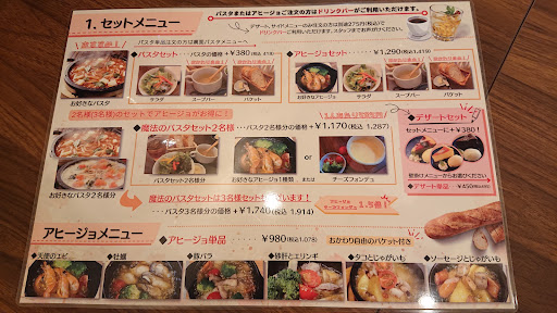 『魔法のパスタセット2名様』を注文。 アヒージョを選びました。 セットを頼むとスープバー、バケット食べ放題。パスタまたはアヒージョ注文でドリンクバーが無料です。バケットはバターつき。スープバーは具材もしっかり入っており、トッピングも種類豊富(胡椒にフライドガーリックや食べるラー油などなど…)ドリンクバーもいろいろあってサービス面も大満足です。