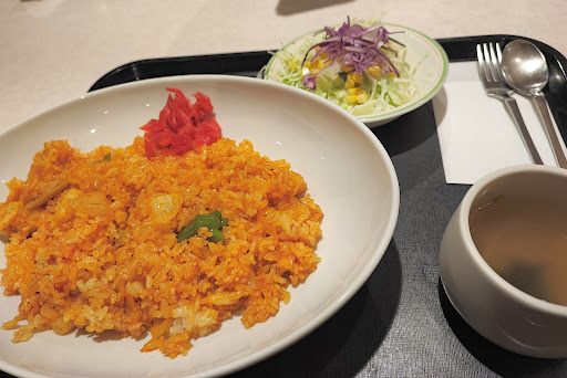 初めて見る赤いエビピラフは、トマトベースのナポリタン風チャーハン、もしくはチキンライスという感じで、想像していたものとは違っていましたが(炒めご飯はピラフではないというのが自論)食べてみるとなかなか美味しい(´~`)♪ ナポリタン風チャーハン、Goodです︎︎👍
