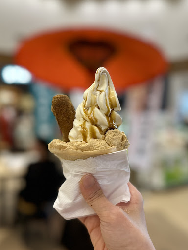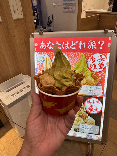 Read more這間店位於休息站的邊角,不容易察覺,還好我在用餐東張西望的時候看到了廣告看板,把桔梗信玄餅變成霜淇淋實在是太酷的idea了,暗暗下定決心吃完正餐一定要去買來吃吃看。 可能被廣告看板燒到的人也不少,我前面排隊的兩組人都是要買桔梗信玄霜淇淋的,排隊的過程中也有其他甜點看起來好好吃,我都差點忘記,我是為了接梗信玄霜淇淋來的。 吃起來真的很像吃桔梗信玄餅耶,味道跟我腦中想像的一模一樣,但是更真實了味道跟口感都是桔梗信玄,完全...