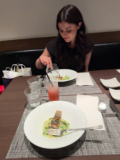 In an attempt to eat some salad after 10 days of Japanese food (albeit delicious) we went to this “Italian” place. It had 2 fixed menus, and the appetizer included a little salad! Better than nothing! However the appetizer was excellent with an espresso cup’s worth of fresh mushroom consommé and a dollop of ratatouille. The sausage pasta was delicately flavored and the focaccia bread 🍞 perfect to sop up the garlic broth. Recommended, and worth the stroll across the bridge from the main shopping street, Omotesando. Its Italian name is Tre Verdi, but don’t expect any jovial Italian owner...