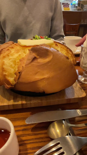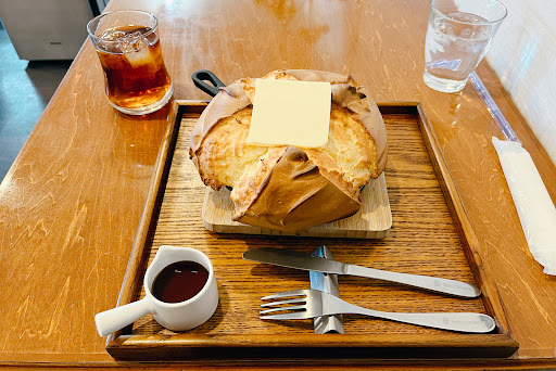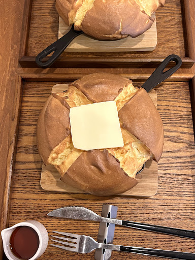 とにかく《百聞は一見にしかず》 圧倒的ビジュのパンケーキ♡ ちなみにこのパンケーキ、焼き上がりまでに30分かかる為、ご注意ください。 ちなみに途中からパンケーキの焼かれる甘い香りがしてきてテンション上がります♡ 待つこと30分。 パンケーキ登場♪ と、共に『おおーっ!』 お…おっきいー!!笑 顔よりデカいパンケーキ、キターwww♪ 圧倒的ビジュのパンケーキは スキレットに乗ってやってきました♡ こんな楽しいパンケーキはなかなかお目にかかれない!とにかく一旦見学タイム。 大きめのバターが乗っていてじわじわと溶けていきます。 見学が済んだら笑、ナイフでカット なのですが、カットしようとしたら …すんっ サクシュワすぎてナイフがいらないレベル♡ 外側はサックリとしていて中はふわシュワ メイプルシロップをかけてとろける甘さに有塩バターと相まって、ほんのりあまじょっぱい。 トッピングのホイップクリームをしっかり乗せて口の中でとけていく感じを堪能。 見た目の大きさで食べられるかな?と思っていたのですが、このサクシュワは余裕でした♡(私胃袋調べ)