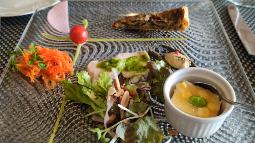 Read moreコストパフォーマンスの高い、京都府のフレンチを語る上で、欠かせない存在と感じられるほど、素晴らしいお店です🇫🇷 駐車場🅿️は、店の前と後ろ側にあり、少なくとも3台程度は停められます。 今回は、何度目の来訪か忘れてましたが、10回近く来てるのは間違え無いです。 今回は、ハーブ鳥の赤ワインと牛すじ煮込みダレのランチコースを頼みました♪ まずは、前菜盛り合わせが来て材料などを説明してくれます。多彩な地元野菜🥬で構成されているので、舌が喜んでます^_^ 続いてパンが3種類出てきます。特に黒いパンは吉野の炭をブランドしており、香りが良いです。他のパンも、とても美味しいです。 次に、スープがまた、ここオリジナルのスープでネギや胡椒が良く効いて、味わい深いものです。スープの底に茶碗蒸しが敷かれており、食感に深みと滑らかさを付与しています。 次に、今回のメインディッシュ。ソースに隠れて鶏肉が見えてませんが、様々な具材が入っており、色んな食感と奥深い味が楽しめます。 鶏肉は骨付きであり、骨付きならではの濃いめの味が楽しめます。 デザートは宇治抹茶とクリームチーズのプリンとラム酒と小豆のアイスクリームです。 毎回、濃厚でオリジナル感溢れるデザートで 後味がとても良いです。 これで二千円ですからコストパフォーマンス高いです。値上...