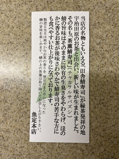 TVで紹介のあった茶薫鯖寿司を予約してテイクアウトしました。予定より取りに行く時間が早まる旨、電話でお願いしたところ、とても感じが良く安心しました。期待大。持って帰って、夜ご飯に頂きましたが、立派な鯖寿司で1本を3人で分けました。鯖を味わった後、お茶の香りもふわっと感じてとても美味しかったです。...