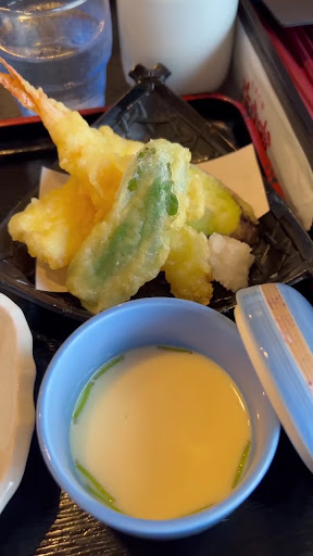 内容は〜 刺身に天ぷら 小鉢2つに茶碗蒸し ご飯、香の物、味噌汁、甘味物