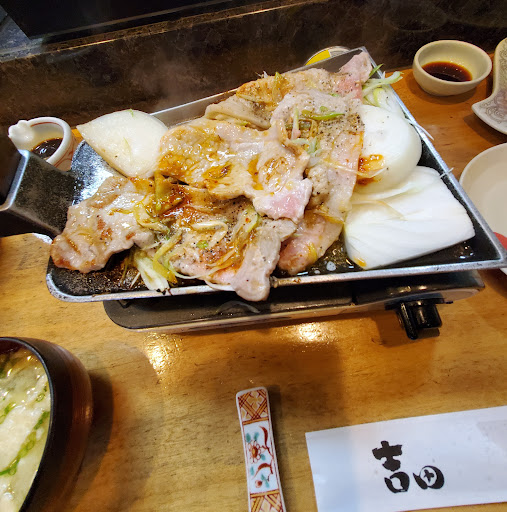 お寿司は12貫も入ったランチで、ネタも表示してありますので、好みが合えばお薦めですよ👌 しょうが焼は醤油味をチョイスしましたが、大ぶりの豚肉と玉ねぎを自分でコンロで焼き上げる定食は、面白く、とても美味しいですよ👌 定食には味噌汁(白味噌)、茶碗蒸し、ドリンク、デザートがついてお得なセットですよ👍️