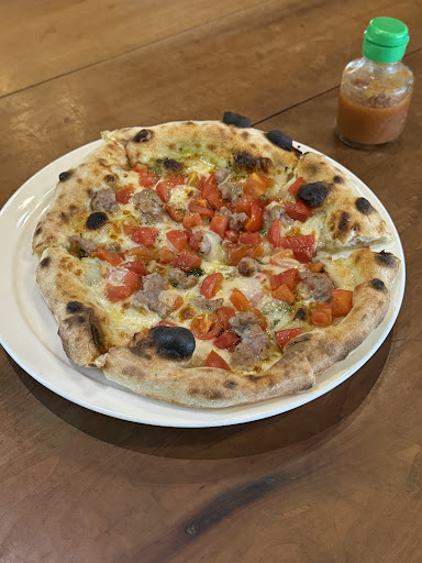 土日祝日限定のピザ🍕 見た目から分厚くてふわっふわ😍😍 小麦の香りともっちり具合がたまんない♡ トマトとソーセージの具材もたっぷり、 そしてチーズもたっぷりなのよ最高🥹 めっちゃ美味しかったです❤️🔥❤️🔥 辛味のソースもおいててくれましたよ〜